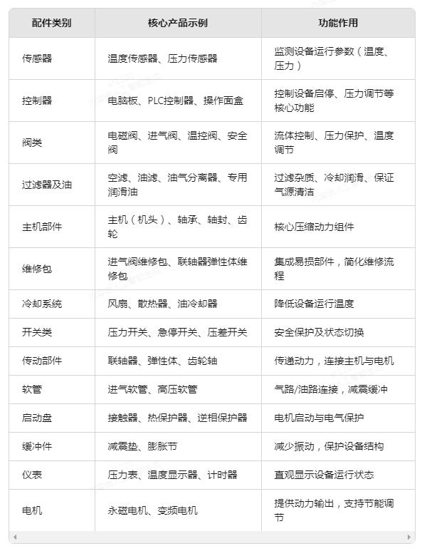 AtlasCopco空压机配件根据功能可分为14个主要类别,覆盖设备传感、控制、过滤、传动等关键系统,具体类型及示例如下表所示: