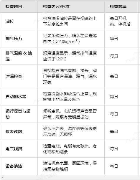 以下是西安进口空压机常见且关键的每日检查项,适用于大多数螺杆式空压机: